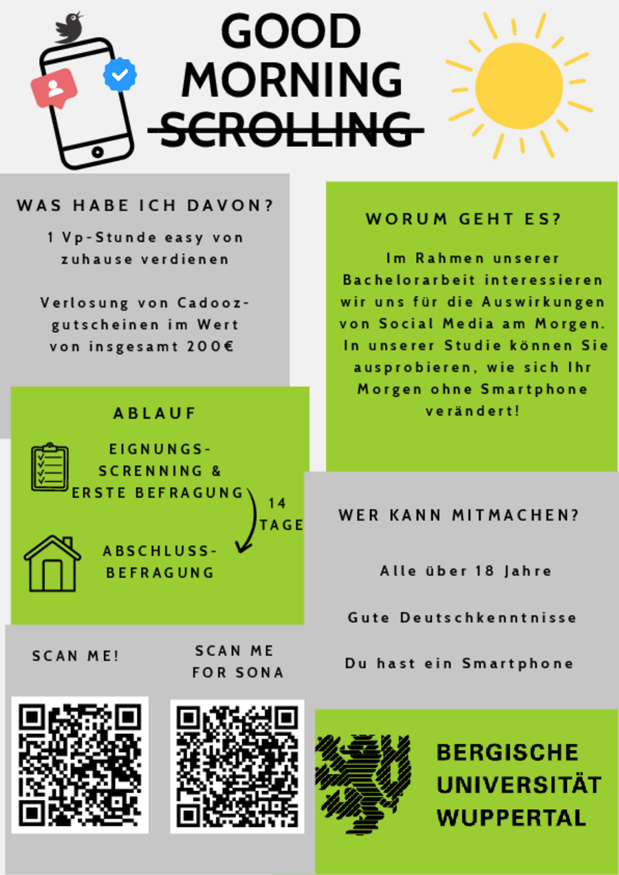 Viele von uns beginnen ihren Tag mit einem Blick auf Social Media Plattformen. Doch wie beeinflusst diese Gewohnheit unser allgemeines und arbeitsbezogenes Wohlbefinden? Genau das untersuchen Antonia Jost und Laura Wirtz im Rahmen ihrer Bachelorarbeit an unserem Lehrstuhl. Teilnehmer*innen haben die Möglichkeit, aktiv an der Forschung teilzunehmen und erhalten im Gegenzug konkrete Tipps, wie sie ihren Tag ohne Social Media beginnen können.
